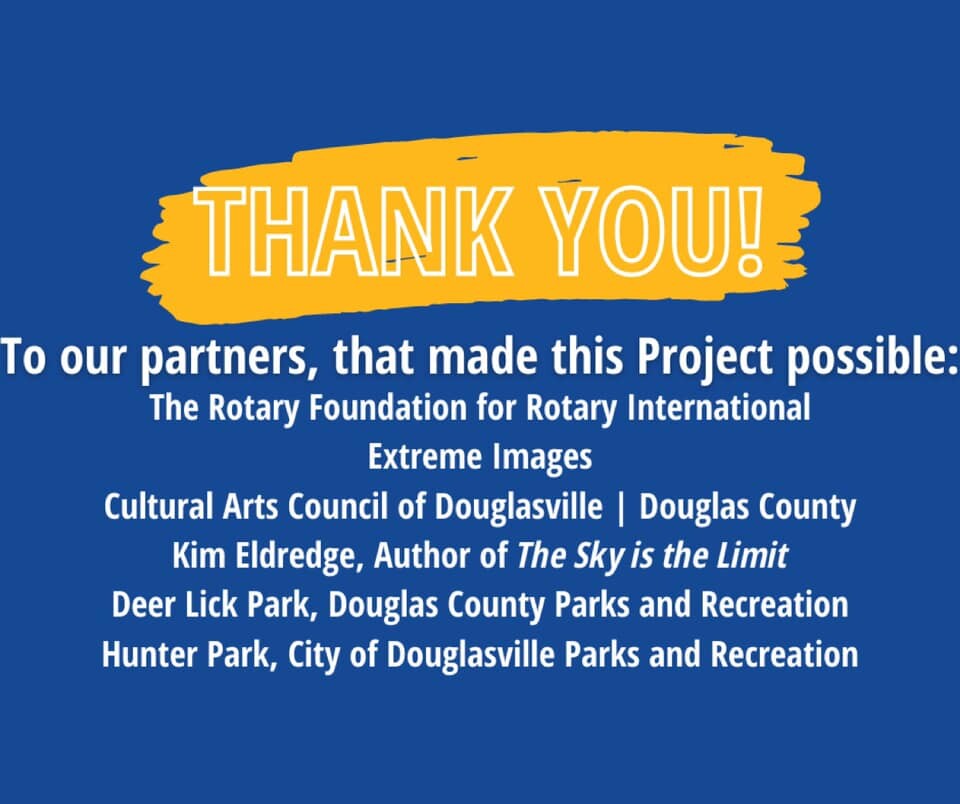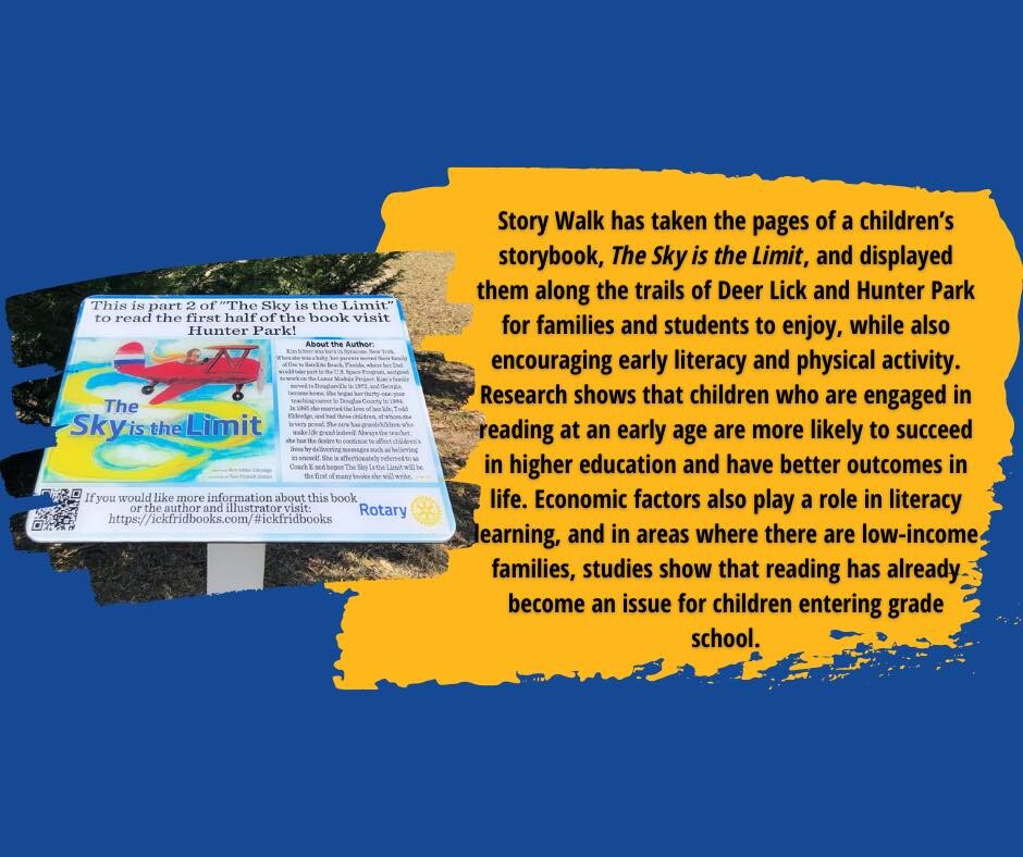 The Douglas County Rotary Club and the Cultural Arts Council of Douglasville / Douglas County have worked in tandem to make a new StoryWalk ® experience at Hunter Park and Deer Lick Park a reality. Local author, Kim Ichter Eldredge, is proud to have her children’s book, The Sky is the Limit, as the featured story. Families can enjoy the first half of the book as they walk the trail at Hunter Park, and then visit Deer Lick Park to complete the book on the trail there.
